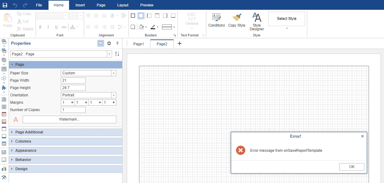 // throw new RuntimeException("Error message from onSaveReportTemplate");