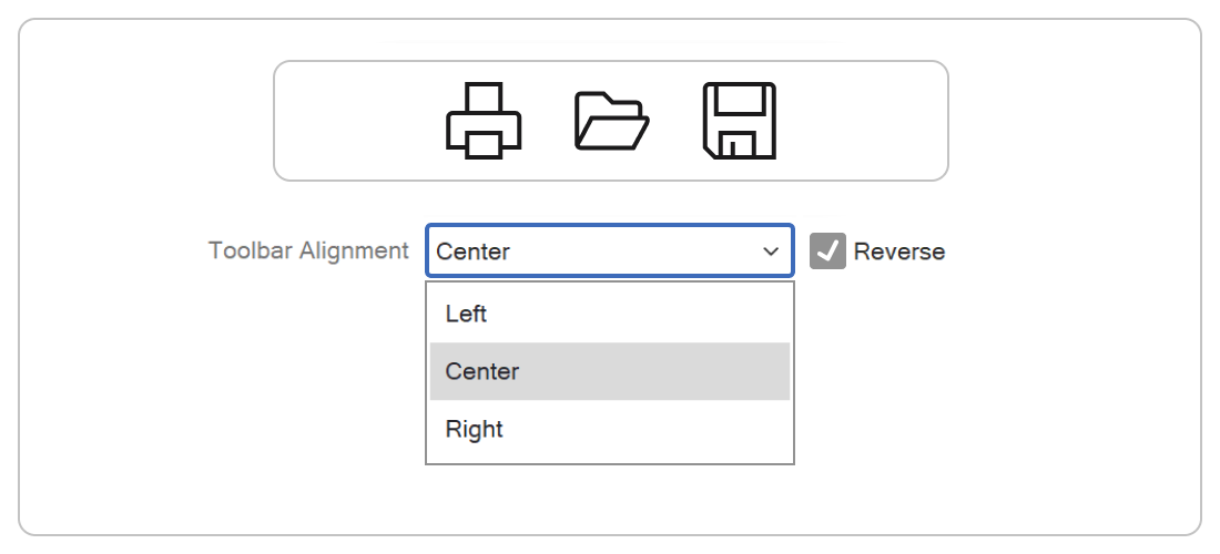 We added flexibility in setting up the viewer for a specific report template or dashboard. You can now change the horizontal position of the toolbar and define it as left, right, or center. The Preview Settings property of the template specifies the location of the toolbar. Also, you can display the commands and controls of the viewer toolbar in reverse order by turning on the reverse mode.