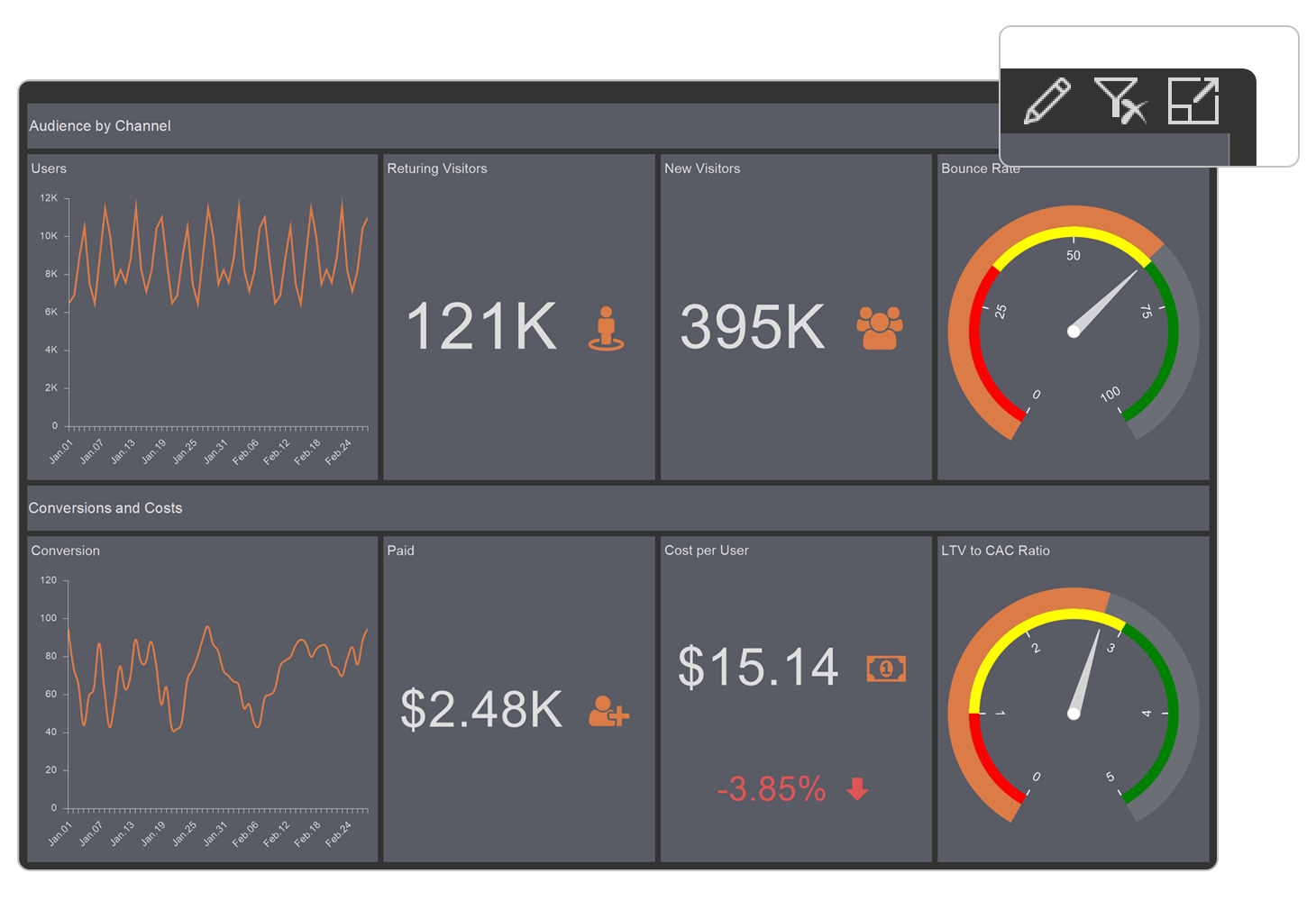 When viewing dashboards, you can reset all element filters to their default state with one click. For this, a special command Reset All Filters is used on the toolbar of the viewer. The visibility of this command on the toolbar is controlled in the Preview Settings property of the template. For dashboards created in earlier versions, the visibility of this button is disabled by default.
